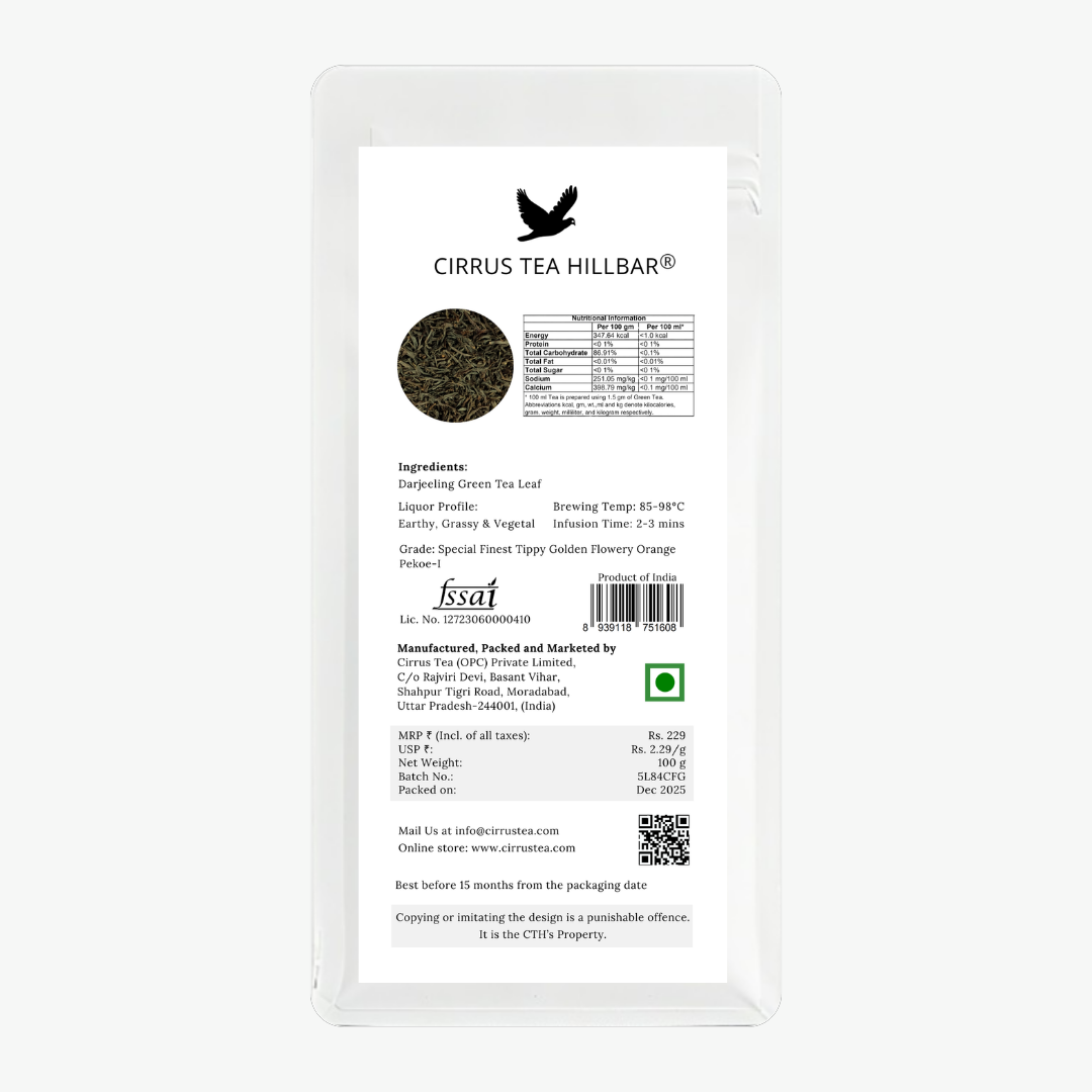 Cirrus Tea Hillbar presents Flavano, an exquisite single-origin SFTGFOP-1 grade Darjeeling green tea, meticulously handpicked from a high-grown estate where elevation and climate converge to shape its delicate character. This premium green tea brews into a light, luminous infusion with gentle vegetal notes and a wonderfully clean finish that evokes the serene heights of its origin.