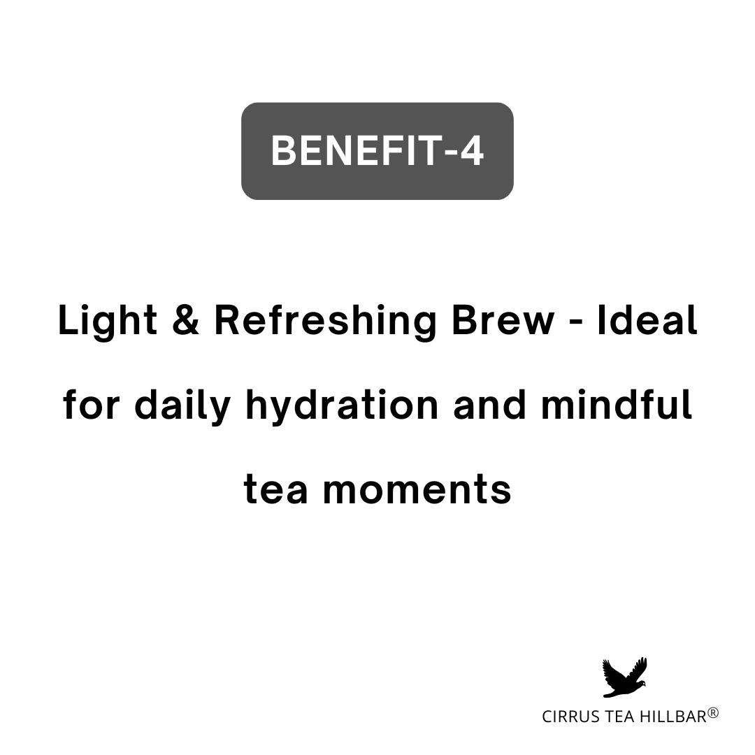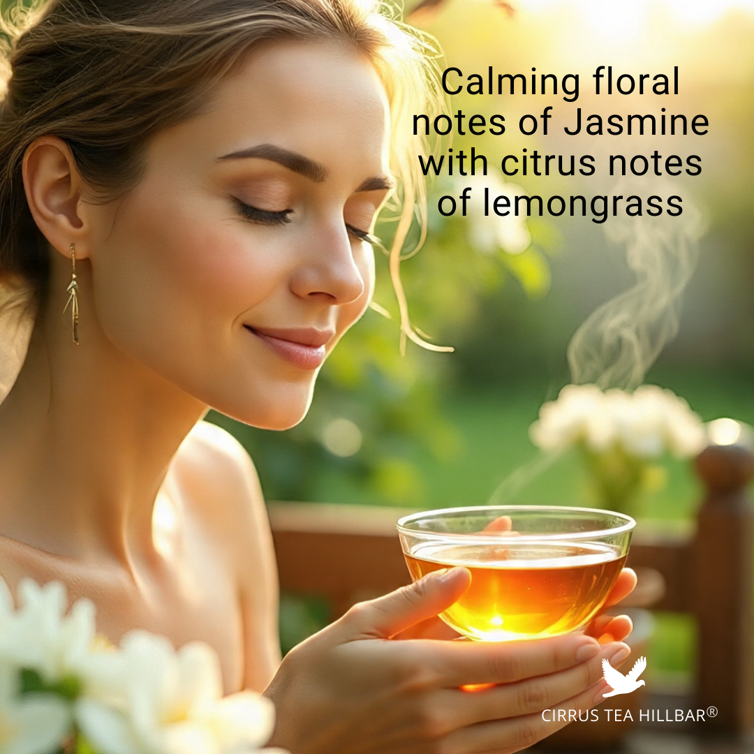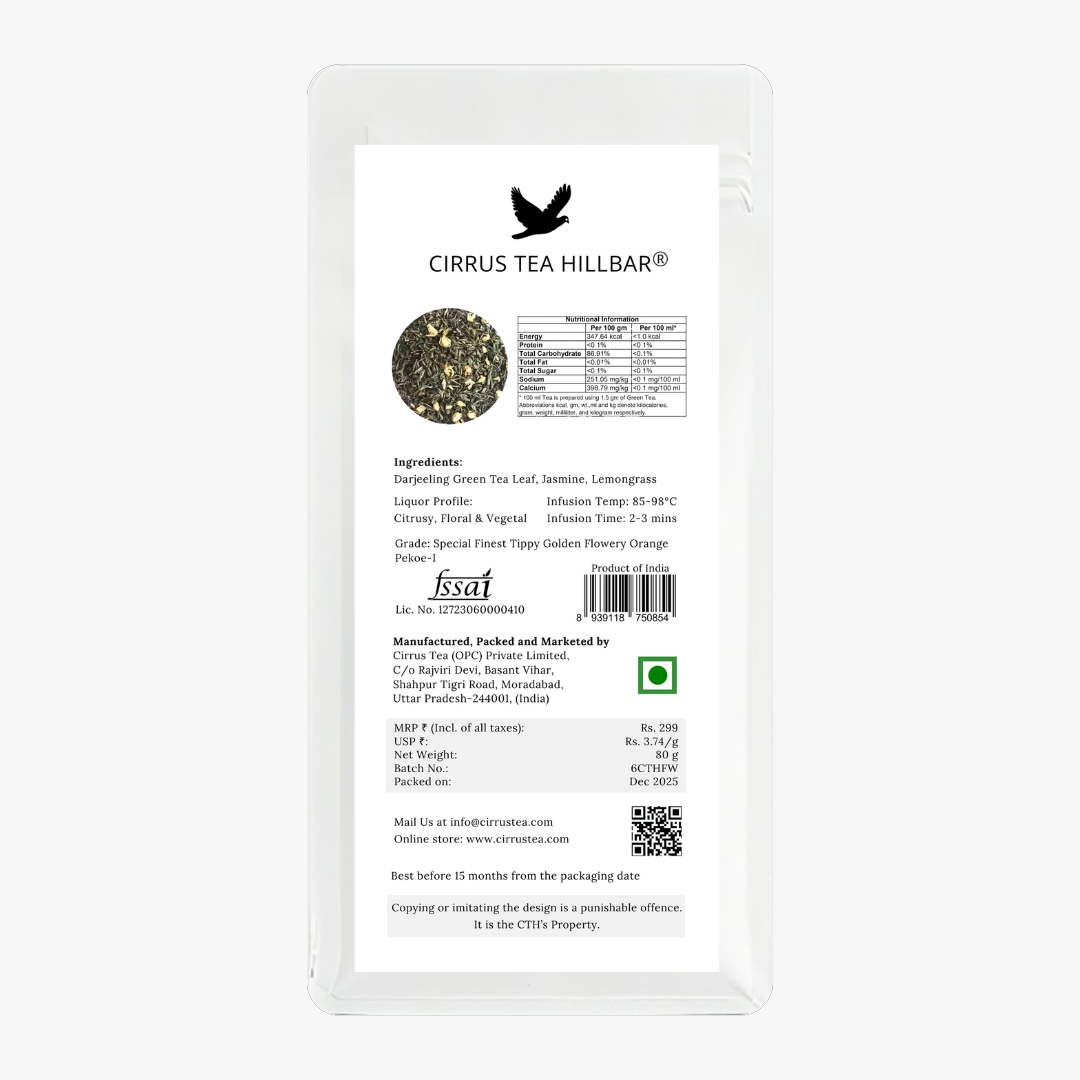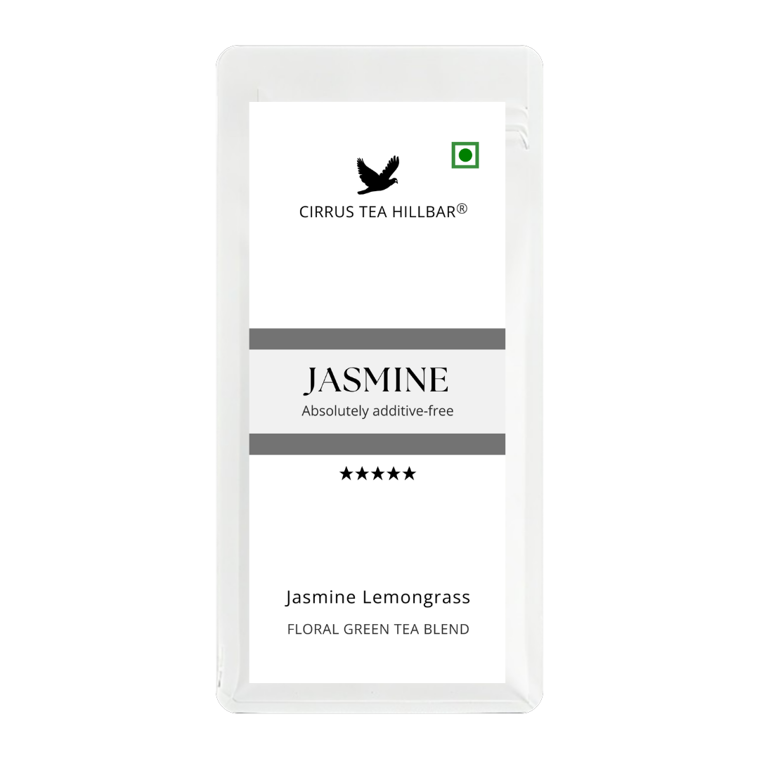 Cirrus Tea Hillbar presents Jasmine, a beautifully balanced single-origin SFTGFOP-1 grade Darjeeling green tea, infused with the delicate fragrance of jasmine blossoms and brightened with a hint of lemongrass. Carefully harvested from a high-grown tea estate, this exquisite blend brews into a light, aromatic cup that delights the senses with floral elegance and refreshing zest.