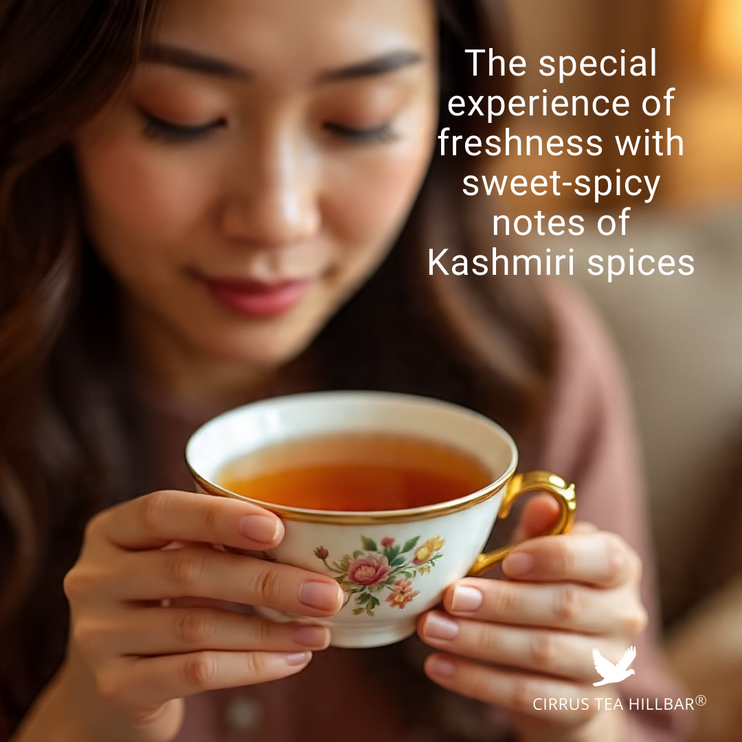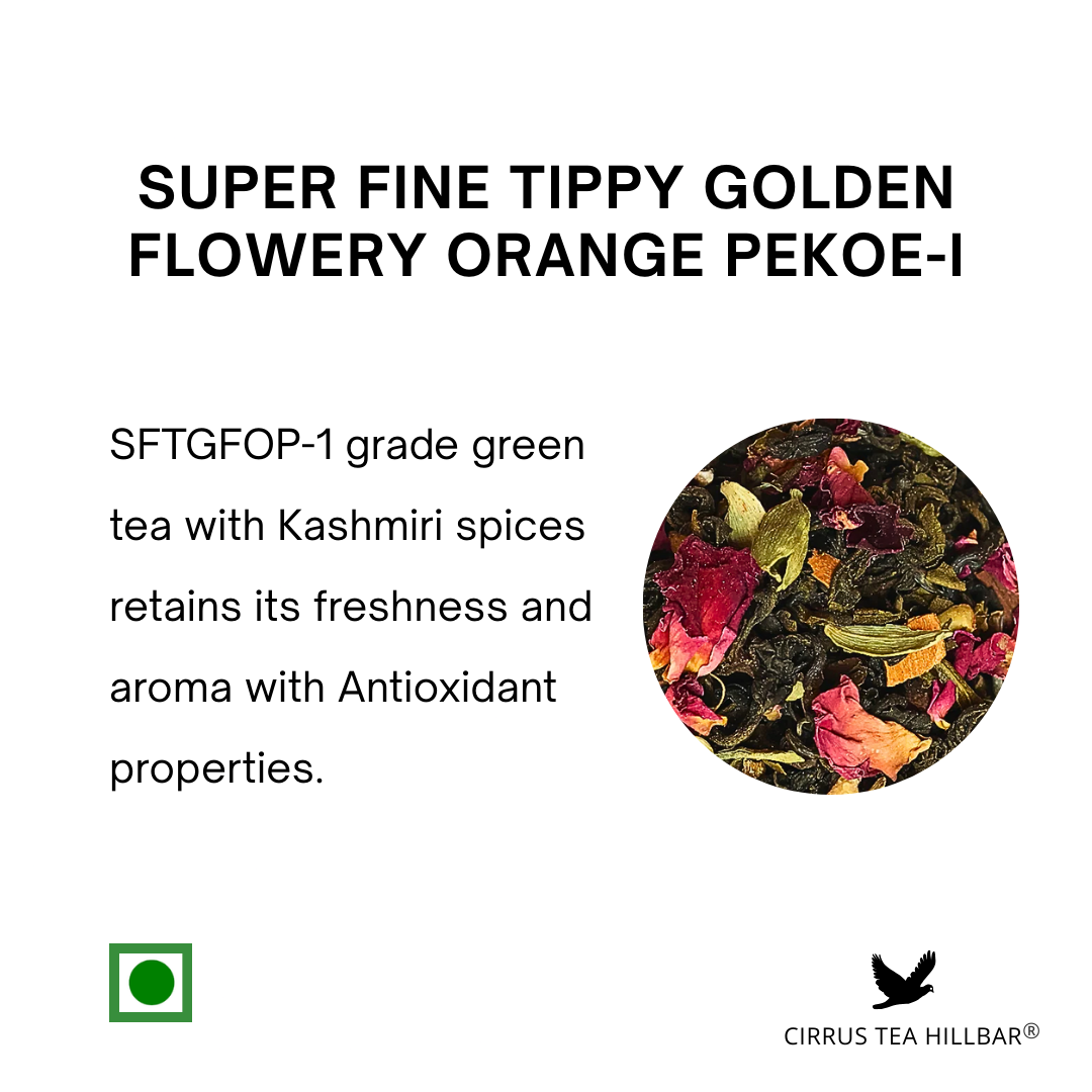 Cirrus Tea Hillbar presents Kahwa, an exquisite single-origin SFTGFOP‑1 Darjeeling green tea artfully blended with the timeless spices of Kashmiri tradition — rose, saffron, green cardamom, cinnamon, clove, black pepper, fennel seeds, and crowned with California almond. Harvested from a high‑grown tea estate, this premium infusion brews into a luminous, golden‑hued cup that is fragrant, warming, and richly layered with spice and depth.